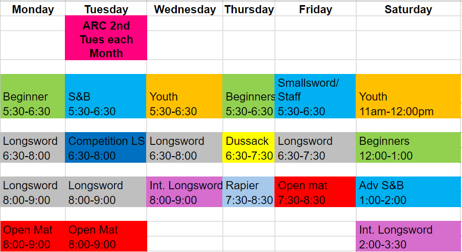 Smallsword and Staff - These are now held on Friday at 5:30pm. Smallsword shall be the 1st and 3rd week of each month, with Staff on the 2nd and 4th. If there is a 5th Friday it shall be Smallsword.